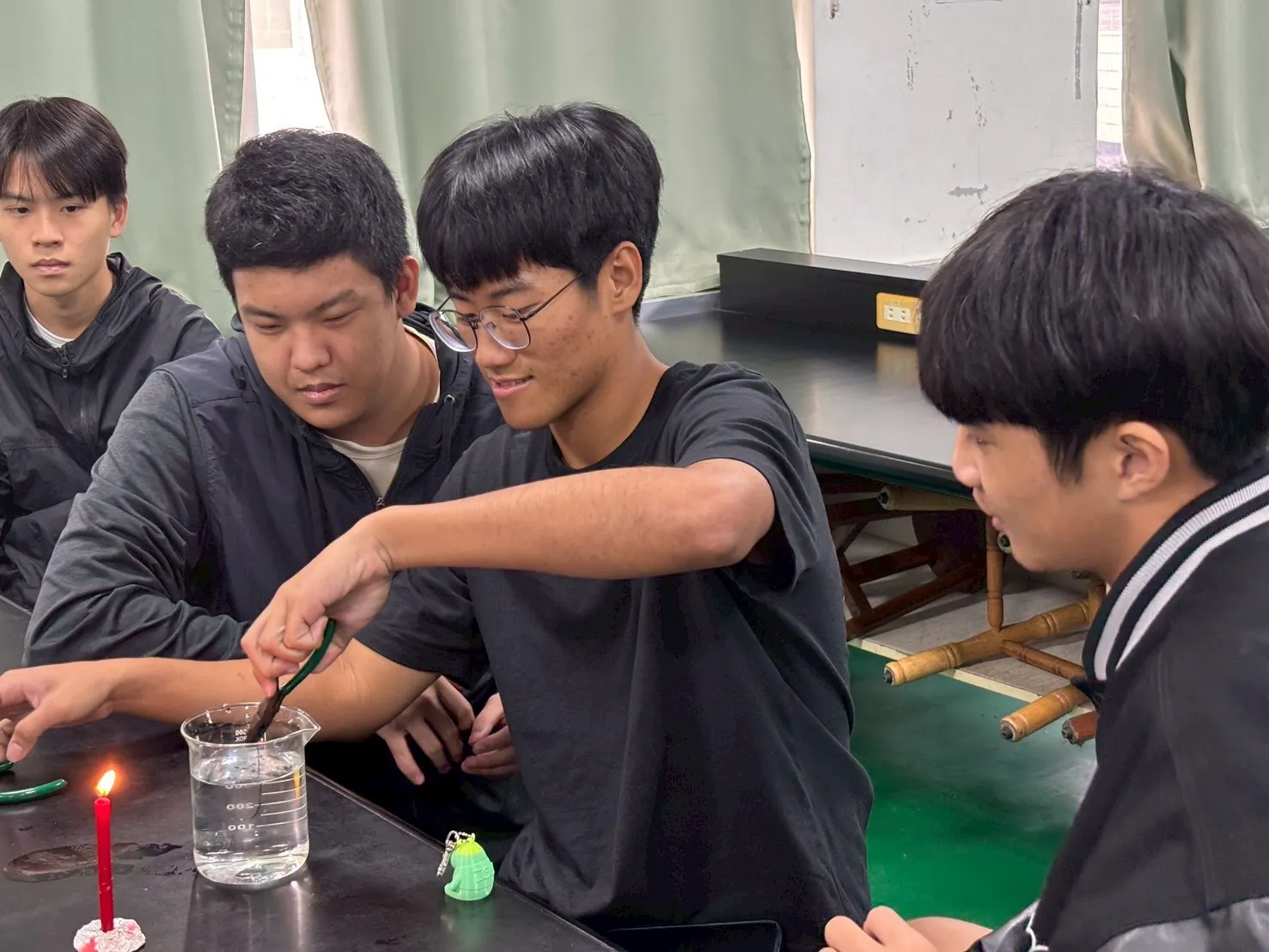 在實作體驗環節,陳厚光老師與研究生帶領學生進行「記憶合金」實驗操作。透過親手實驗與即時講解,學生對材料在受熱與形變下的性質變化有了直觀理解,現場不時傳來驚呼與討論聲,學習成效顯著。