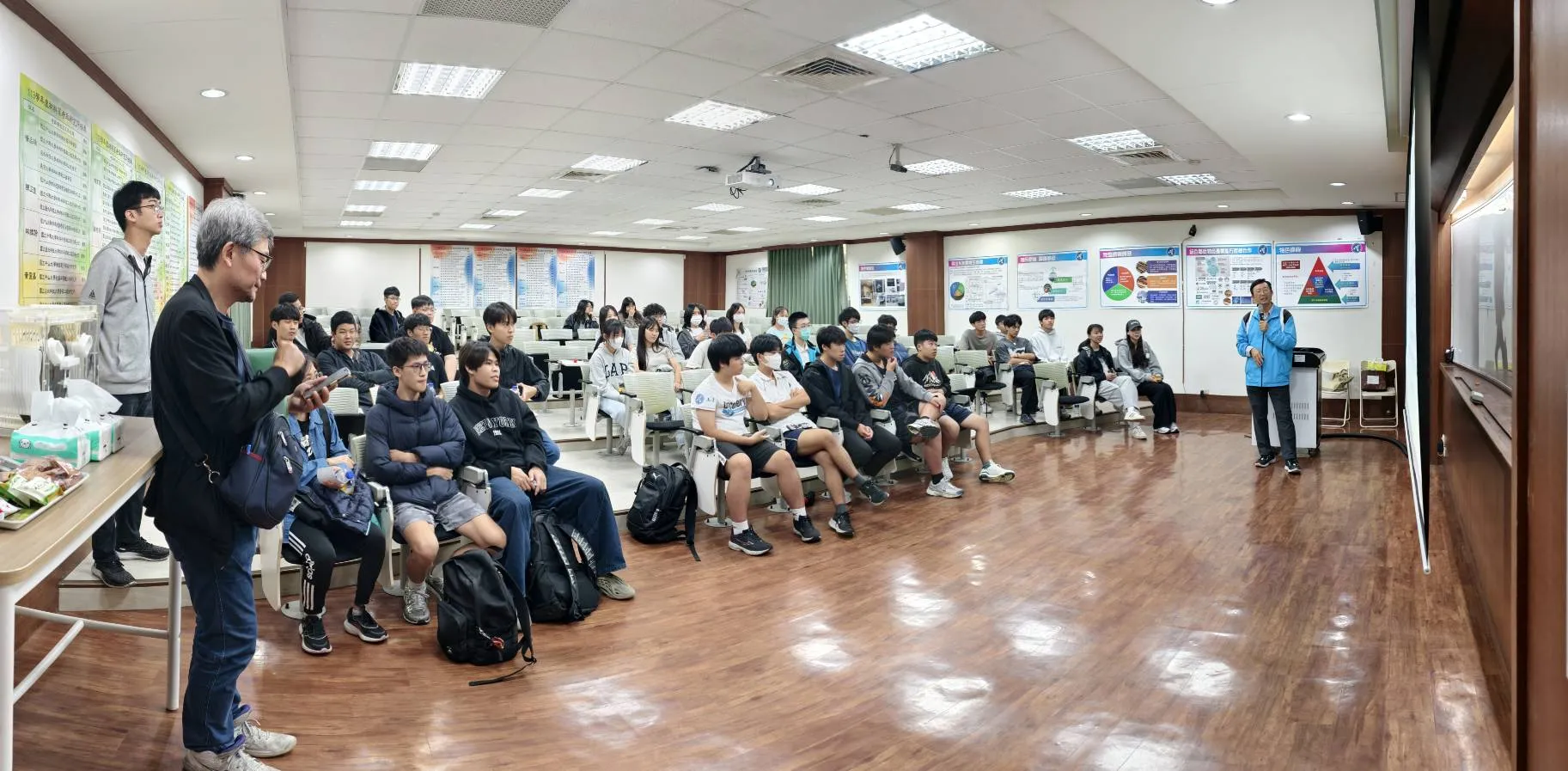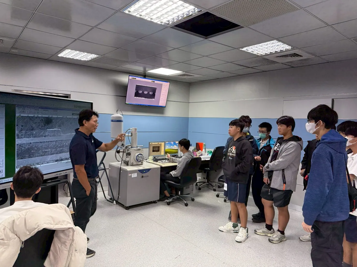 系所方面由林炯棟主任與李國榮老師熱情接待,向來訪師生介紹材料系的教學特色、研究方向與未來發展。隨後,鍾卓良老師及其研究生團隊與貴儀中心曹秀鳳小姐深入淺出地說明半導體製程與多項貴重儀器的功能與應用,讓學生近距離了解高階分析設備在材料研究中的關鍵角色。