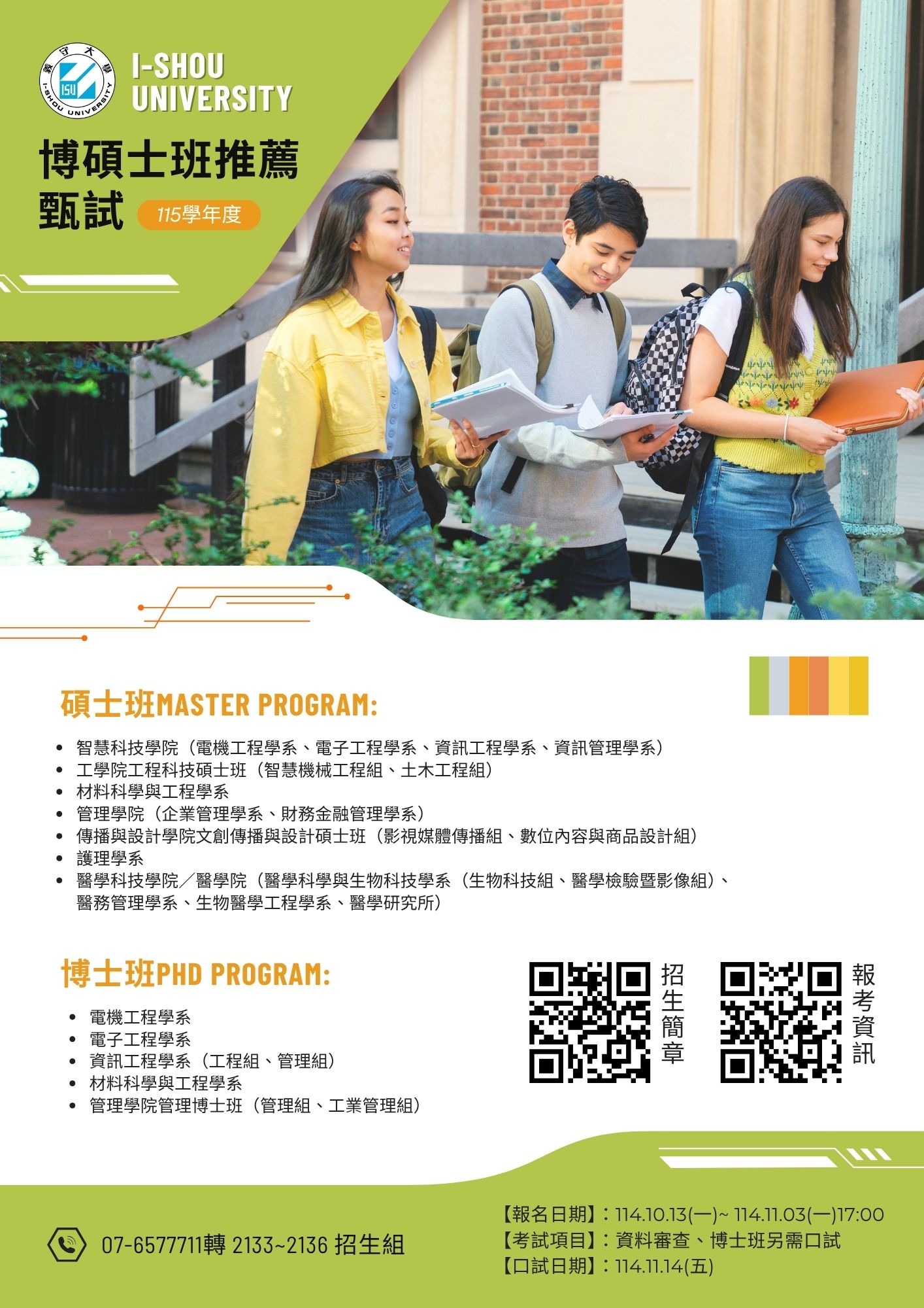 本校115學年度博碩士班推薦甄試相關招生訊息如附件(含簡章、報名優惠、優秀研究生入學獎學金及海報),敬請參閱下方連結。